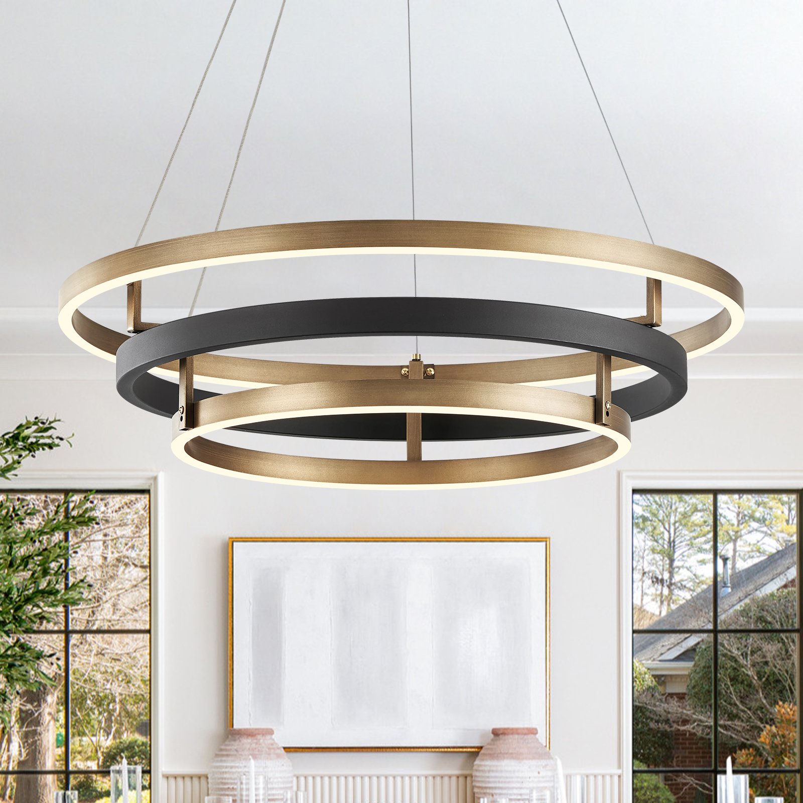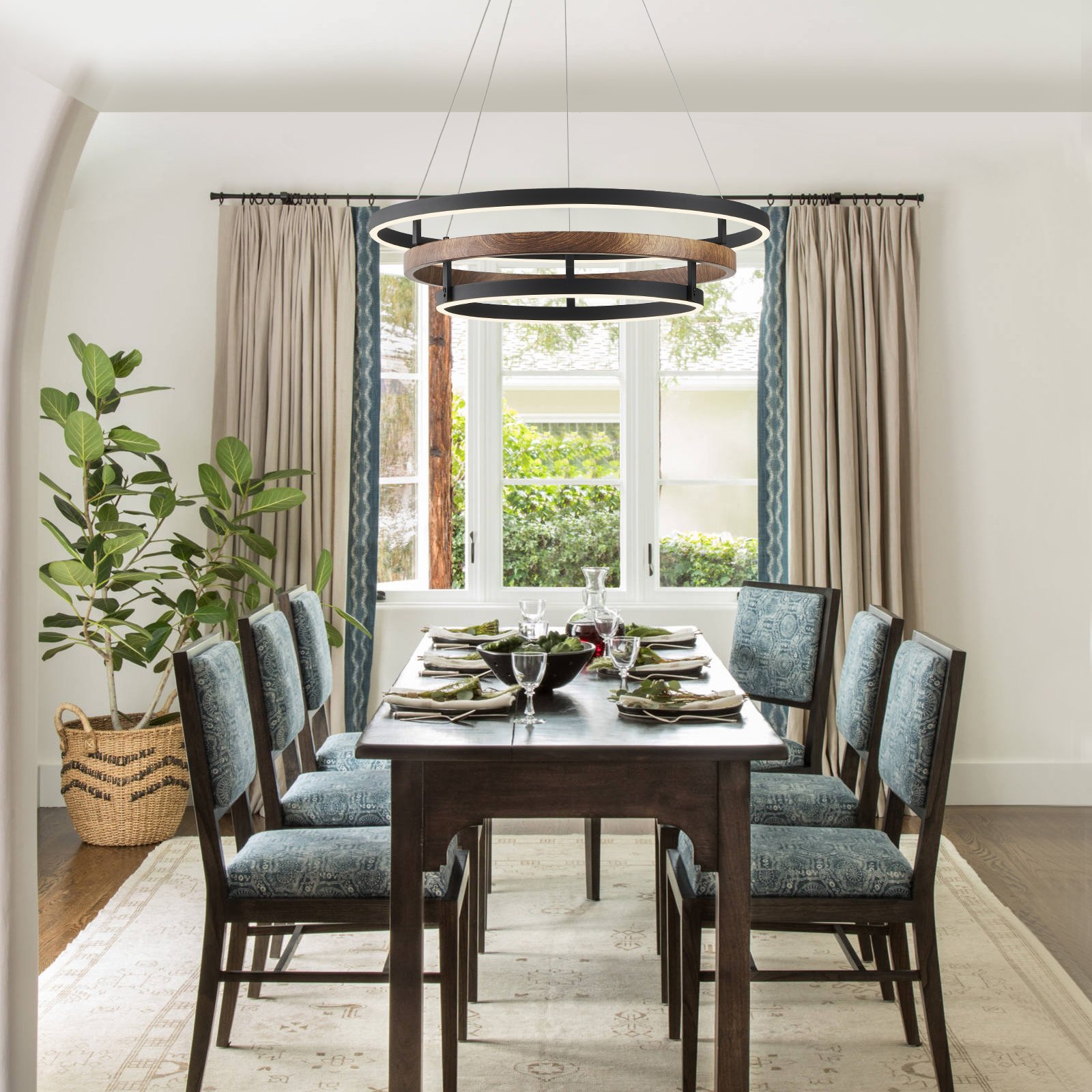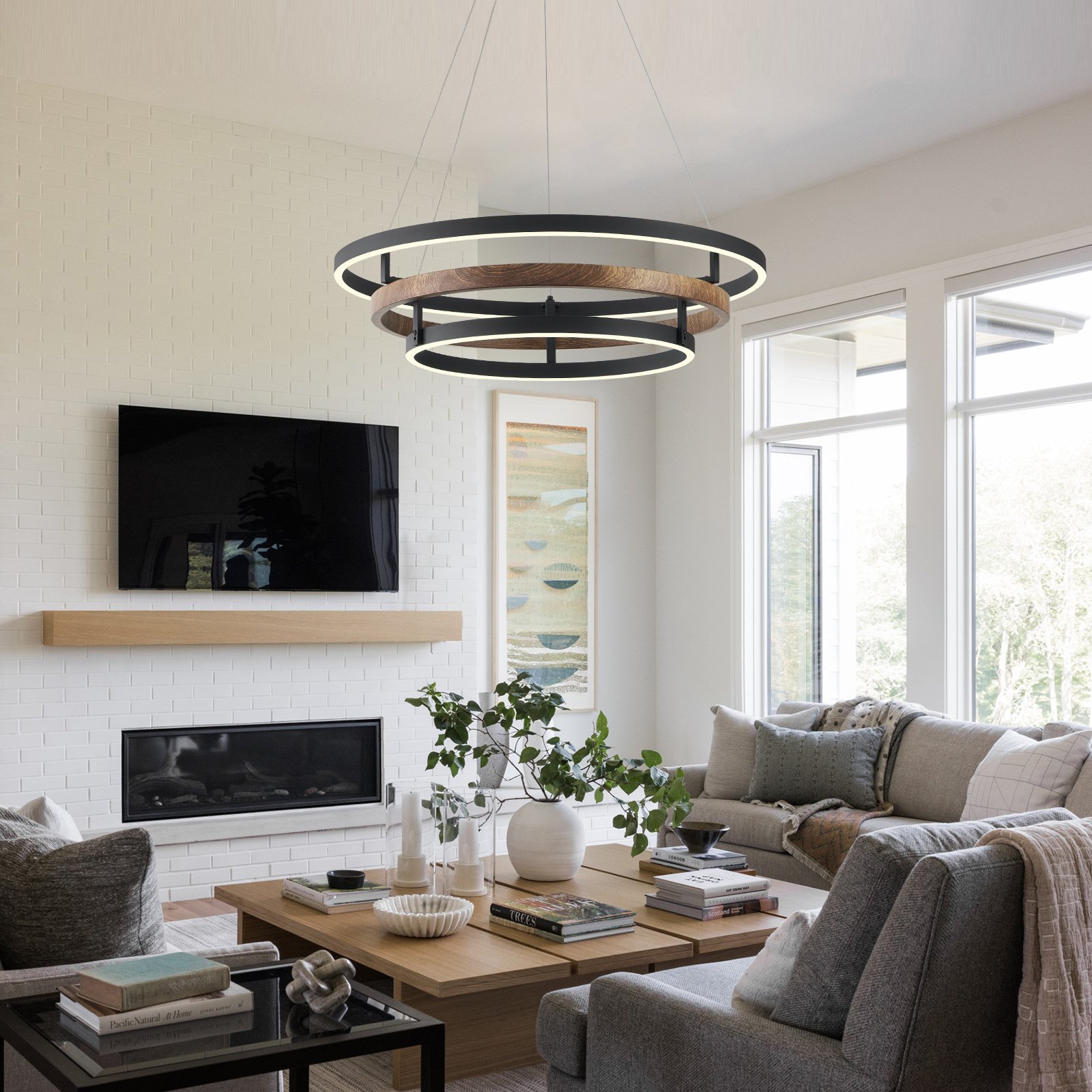 Fookchak Modern living room LED chandelier with 1 wood-printed rings and 2 modern black ring, creates a mixed statement of modernism and a farmhouse vibe. This dining room modern 3 ring pendant light is compatible with versatile indoor styles, whether modern minimalism or farmhouse. A stylish 3-ring chandelier lighting for kitchen, dining room, living room, bedroom, foyer.