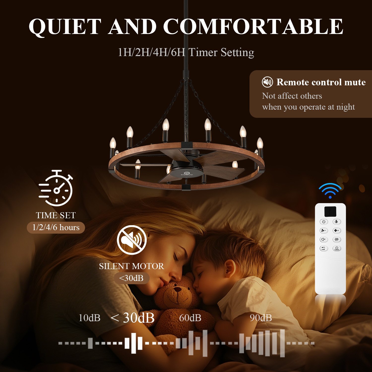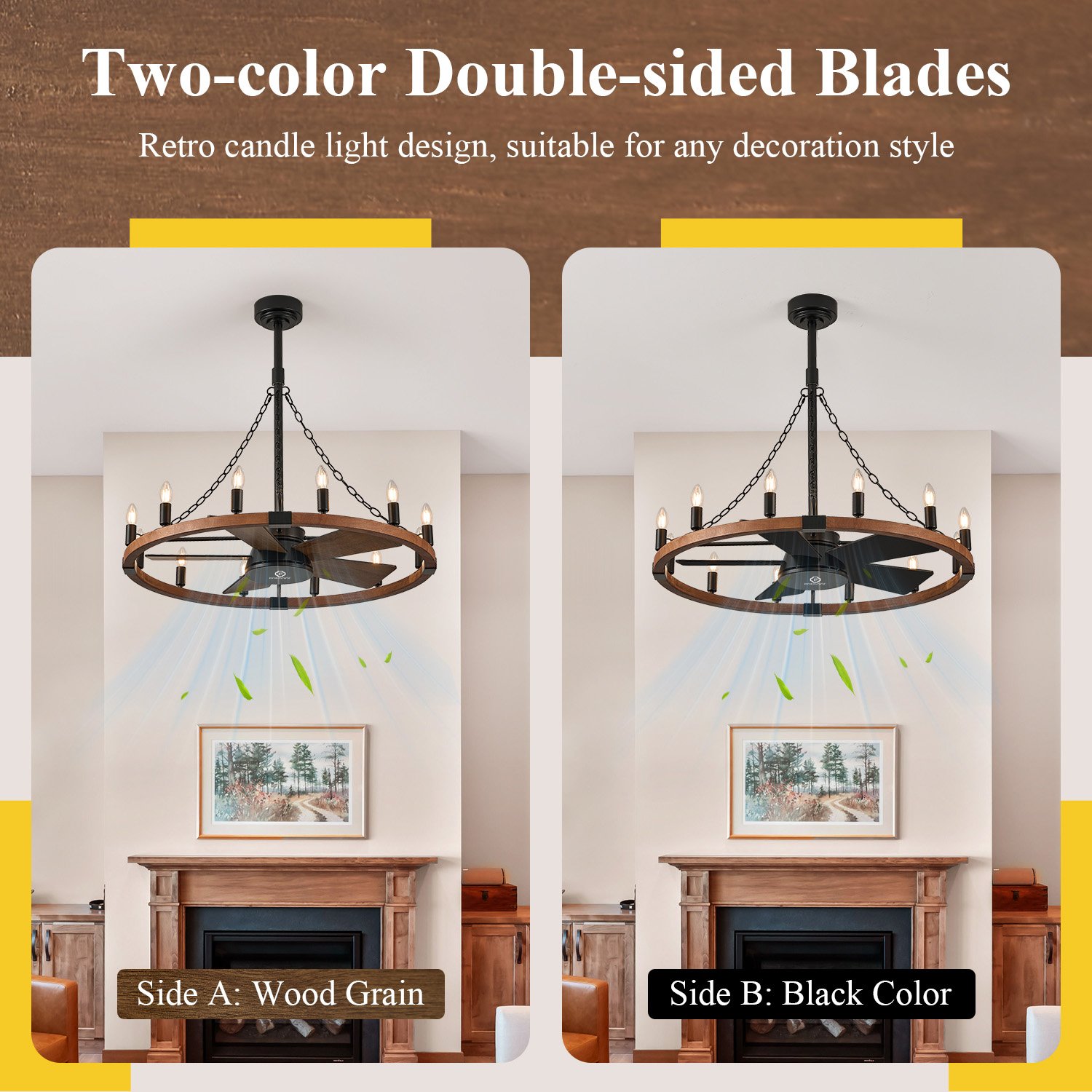 This rustic wood ceiling fan light comes with a multi-function remote control, which allows you to set 6 wind speed levels and 1/2/4/6-hour timers, making your daily life more convenient and effortless. It features reversible blades suitable for all seasons, while its reversible DC motor delivers powerful airflow with quiet operation